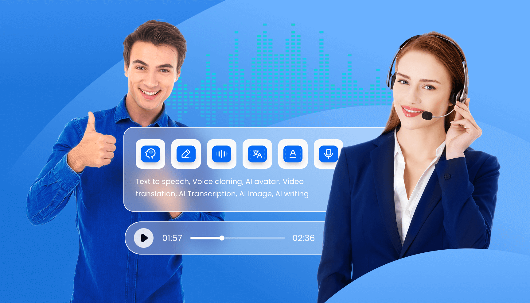 Text to speech, Voice cloning, AI avatar(Photo avatar, Gesture avatar, Instant avatar cloning), Video translation, AI Transcription, AI Image, AI writing