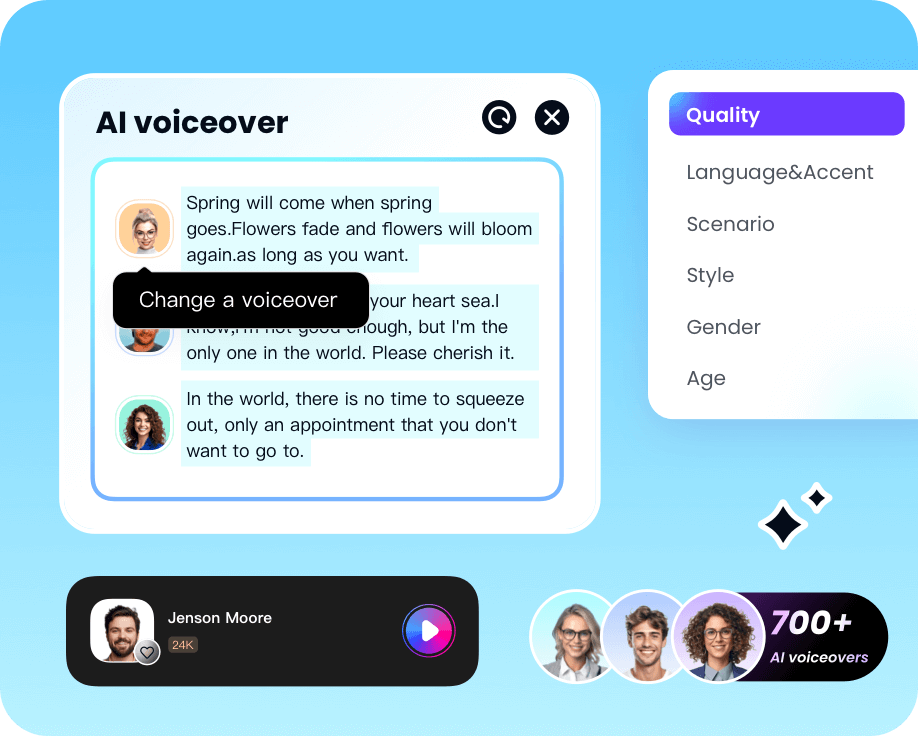 Instantly create high-quality voiceovers from your text with our Al voice generator. Preview, customize, and combine multiple voice styles-all in one seamless file.